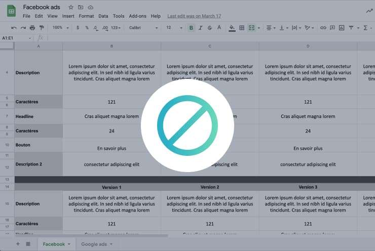 Créez vos publicités en quelques clics et assurez-vous de toujours respecter les spécifications techniques de Google et Facebook.